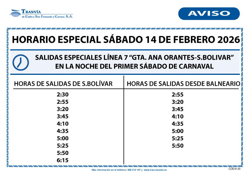 Línea 7 ,no sufre variación en el horario de mañana ( finaliza servicio a las 16:00 h) y se establece un horario especial por la noche con salidas desde las 2:30 h hasta las 6:15 h desde Simón Bolívar con una frecuencia de 25 minutos (puede consultar horario aquí).